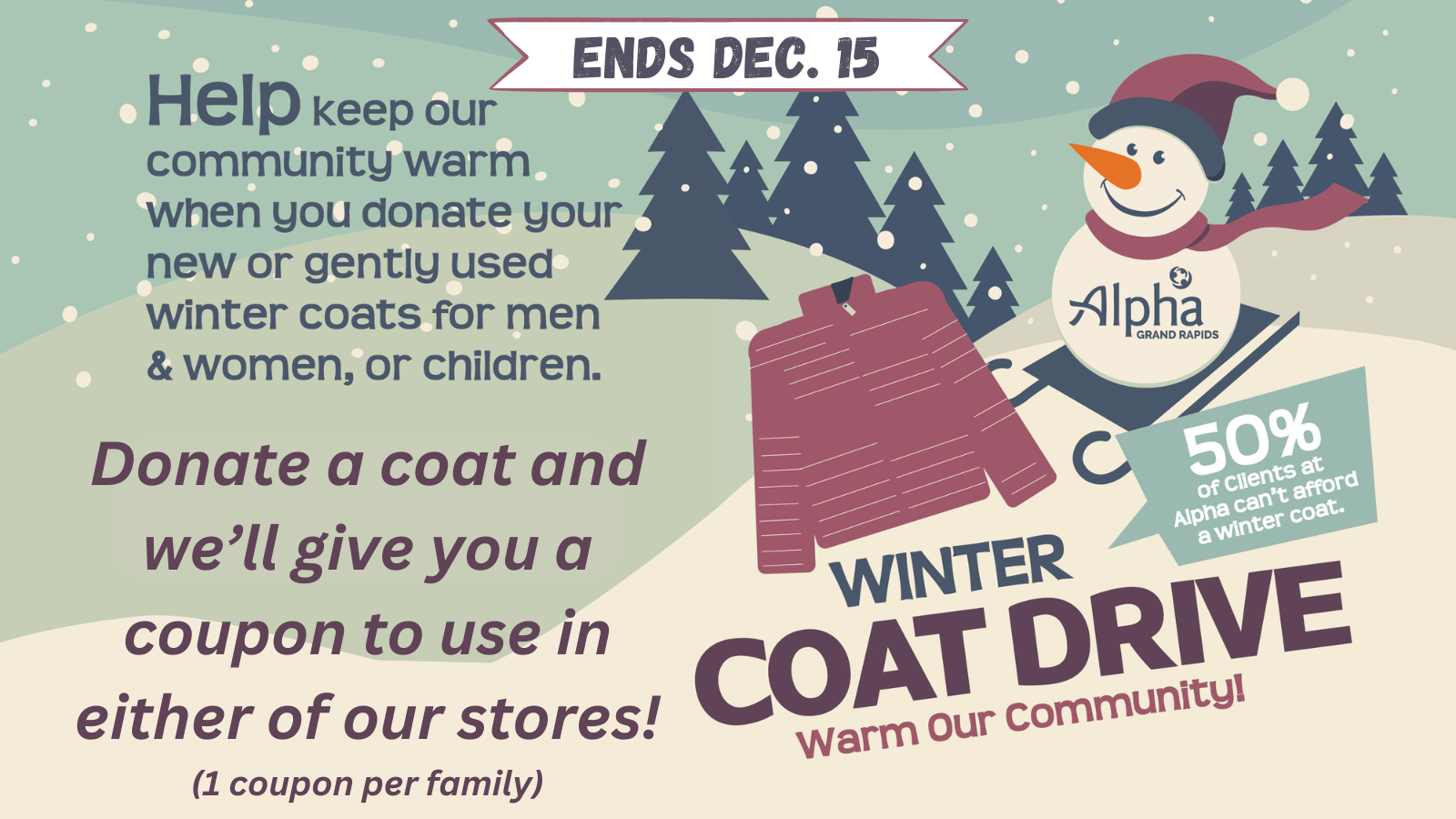 The HSB has partnered with Alpha Grand Rapids for another Coat Drive! Drop off your donation of new or gently used coats for men/women/children and we'll give you a coupon* to use in either of our stores. See details.