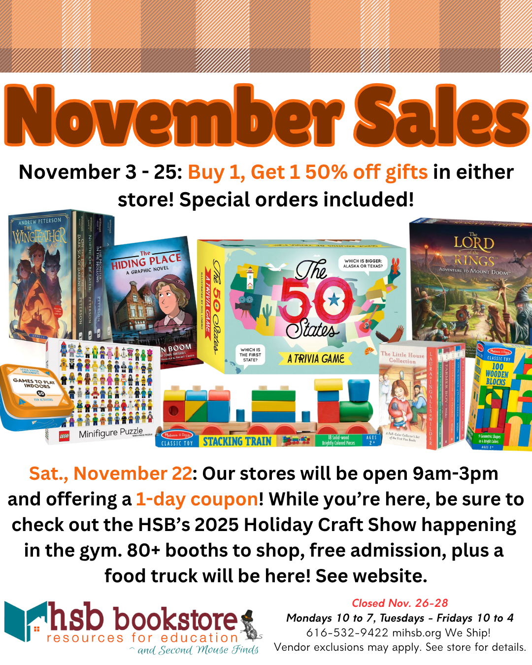 Sat., November 22: Our stores will be open 9am-3pm and offering a 1-day coupon! While you’re here, be sure to check out the HSB’s 2025 Holiday Craft Show happening in the gym. 80+ booths to shop, free admission, plus a food truck will be here! See website.